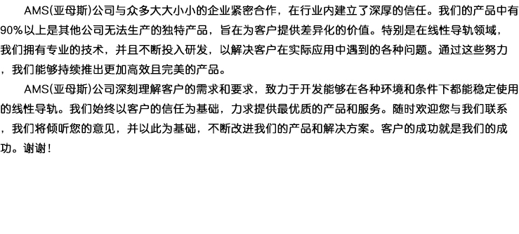 亞母斯(AMS)導(dǎo)軌不用加油,不生銹,噪音低振動(dòng)小,重量輕,高速度,無(wú)磁性,適用于潮濕、粉塵、木屑等惡劣環(huán)境。